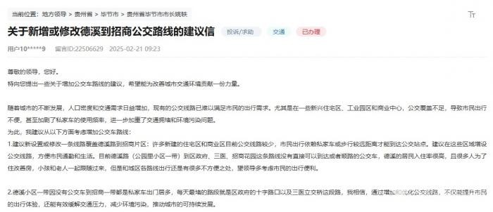 “随着城市的不断发展,人口密度和交通需求日益增加,现有的公交线路已难以满足市民的出行需求。尤其是在一些新兴住宅区、工业园区和商业中心,公交覆盖不足,导致市民出行不便,甚至加剧了私家车的使用频率,进一步加重了交通拥堵和环境污染问题。”近日,毕节市一网民通过留言提出增加公交车路线的建议,“通过新设置或修改一条线路覆盖德溪路到招商片区,方便市民通勤和生活。”