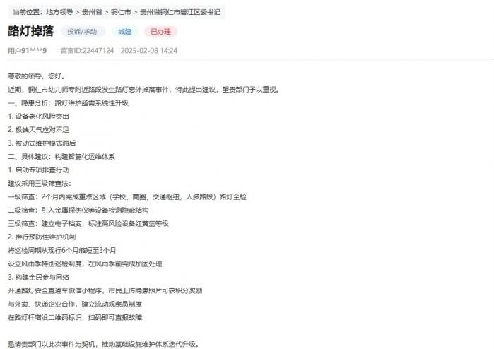 “近期,铜仁市幼儿师专附近路段发生路灯意外掉落事件,特此提出建议,望贵部门予以重视。”网民在留言中分析了路灯维护存在的隐患,“设备老化风险突出,极端天气应对不足,被动式维护模式滞后。”