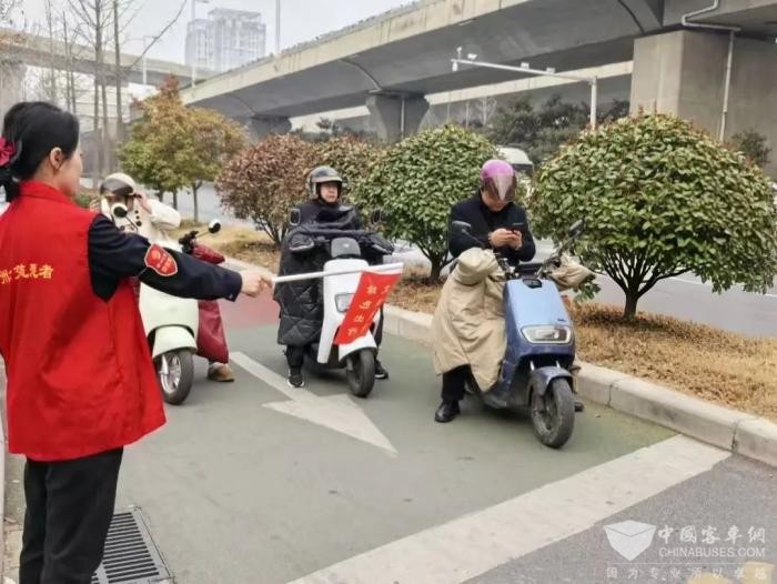 在市区主干道路口,公交车长化身志愿者,利用业余时间开展行车安全指引活动,他们身穿红色志愿者马甲,手持文明交通小红旗,在非机动车停止线附近,有序引导非机动车遵守红绿灯信号,确保交通顺畅有序。同时,志愿者们还积极向骑乘人员宣传安全出行的重要性,提醒他们戴好头盔,增强安全意识。