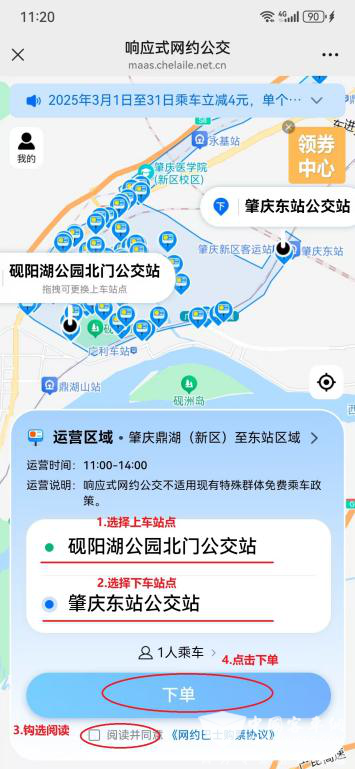 3.选择最近的乘车地点和目的站点、乘车人数,勾选“阅读并同意”《网约巴士购票协议》,就可点击下单。