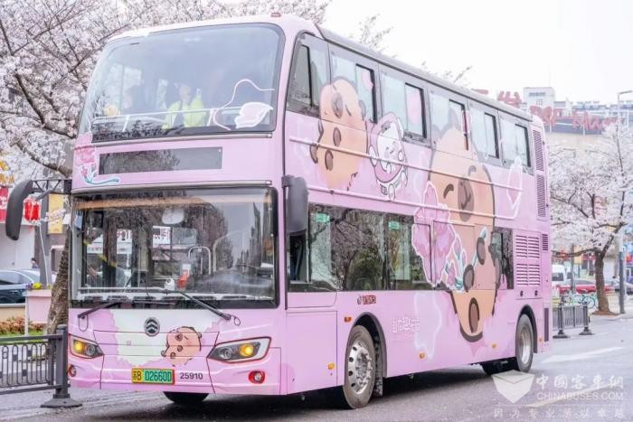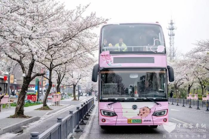 这辆双层巴士堪称春日里的颜值担当,车身被浪漫的樱花包围,车两侧巨型卡通形象“卡皮巴拉小黄豚”抱着粉嫩樱花惬意躺卧,圆滚滚的身材,萌呆呆的表情,简直可爱到犯规!这次的限定版卡皮巴拉融入了超多无锡元素,小黄豚手中的樱花,不仅契合无锡“世界三大赏樱胜地”的名号,更将无锡这座城市的温暖与包容展露无遗。
