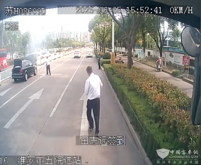 近日,公交淮阴区分公司H12路驾驶员郑健驾车行经淮安市第五人民医院站台时,发现一辆私家车停在道路中央,车辆的发动机盖不断有浓烟冒出,十分危险。