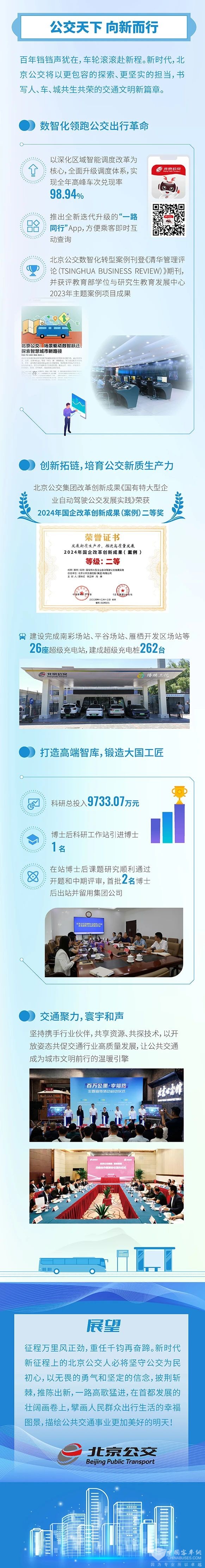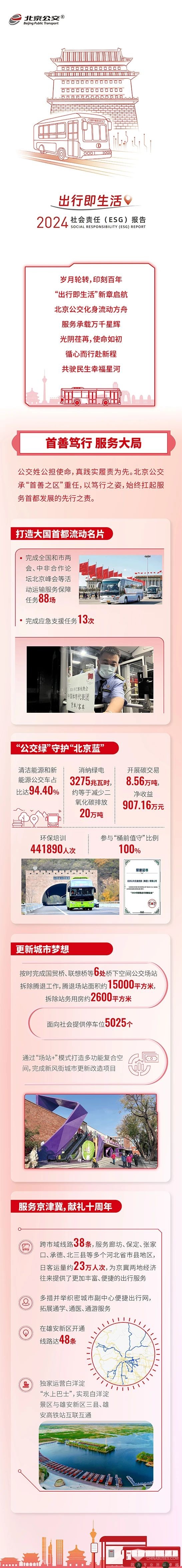 北京公交2024年社会责任(ESG)报告显示,北京公交承担首都责任,服务大局,打造大国名片,助力环保事业,为京津冀地区运营十年。公交串联起各个生活地点,承载起各种文化,守护人民安全。北京公交全力培训员工,传递公益正能量,更实现数智化引领公交革命。