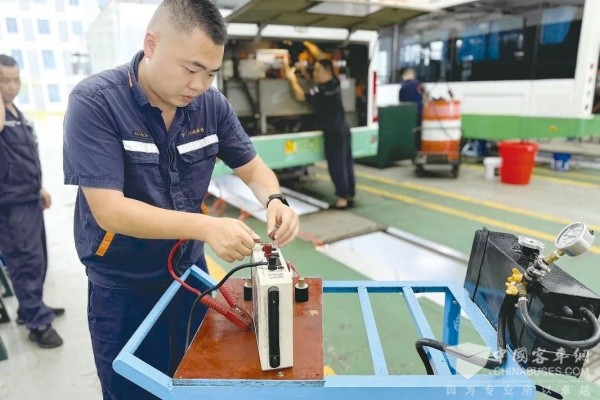 “车辆从烧油变成用电,一切都得从零开始。”行业的变化让桂伟东有了危机感。慢慢地,他和班组同事对“变化”从焦虑变为从容。“我们不断学习,吸收新知识,钻研新能源车的维修保养技术。”通过大量查阅资料、实际操作、请教专家,桂伟东和同事对新能源车驱动电机系统的构造、维修保养有了全面了解,很快就实现了“换赛道”,在日常维修中能熟练操作。