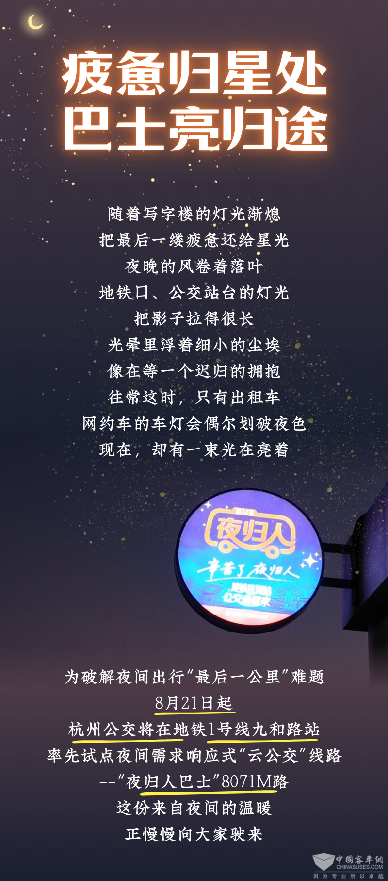 针对发现的夜间出行痛点,杭州公交将在8月21日起推出“夜归人巴士” 8071M路。此次“夜归人巴士”将采用“云公交”的模式,线上线下一体化预约,通过需求响应式服务模式实现市民乘客精准接驳。