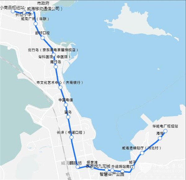 线路设置起讫点:华能电厂枢纽站—小商品枢纽站站点设置:华能电厂枢纽站、海埠、威海港候船厅(沟北村)、城子、外运场站南门、智慧谷产业园、家家悦九龙城、杨家滩、韩乐坊、长峰(中诺口腔)、望岛、中国电信、市文化艺术中心(齐商银行)、南竹岛、骨科医院(中医院)、北竹岛(京东家电家居旗舰店)、舒好口腔、威高广场(华联)、市政府(威海移动通信公司)、长征小学、小商品枢纽站共21站。