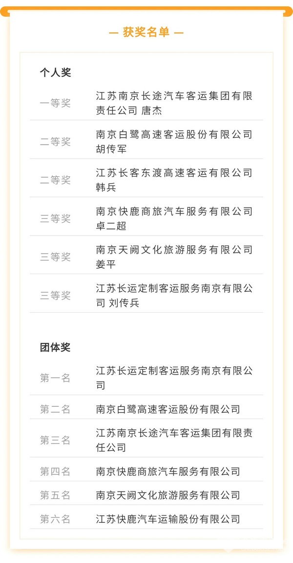 经过两天激烈角逐,江苏南京长途汽车客运集团有限责任公司驾驶员唐杰凭借扎实的理论功底与精湛的实操技能斩获个人一等奖,江苏长运定制客运服务南京有限公司获团体奖第一名(获奖名单见附件)。