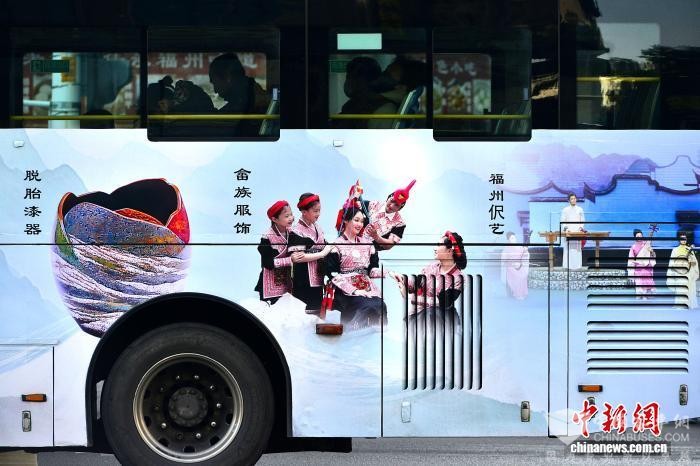 2026年1月8日,喷上精美非遗图案的公交车行驶在福州街头。中新社记者 张斌 摄