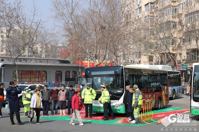 这块与实车比例完全一致的盲区示意地垫上,绿色区域代表驾驶员可视范围,黄色区域为警示区,红色区域则清晰标注出车头、A柱、两侧车身等关键盲区位置。市南巴士一分公司安全经理姜强与执勤交警并肩站在地垫旁,借助这一直观工具,围绕公交车盲区分布、车辆转弯内轮差风险、安全候车距离等关键知识,进行深入浅出的讲解。“很多人觉得站在公交车旁边司机能看到,但实际上大型车辆周边存在多处视线死角,大家看这片红色区域,驾驶员坐在车里是完全看不到的。”姜强一边讲解,一边邀请市民实地体验。