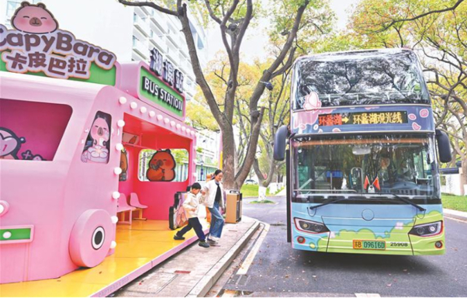 樱花掩映下,印着卡皮巴拉图案的主题双层巴士亮相环蠡湖线,吸引不少家长带着孩子前来打卡。一年级学生周珂锐的妈妈一早便带着孩子来体验。这条环蠡湖线路串联起渔父岛、渤公岛、蠡园、万象城等春游点位,一路湖景、花景相伴。“一天内可以反复乘坐,一个小时一班,我们到了一个景点先下来玩一会儿,再坐下一班继续走,不用一直赶路。”周珂锐妈妈说。“这次不只是换个外观,而是把整条线路当成一次春游体验来设计。”无锡公交锡巴士运务分公司产品研发部主管徐阳介绍,线路设计时充分考虑了亲子家庭的出行节奏,希望乘客能够按照自己的安排随走随停,把乘车过程本身也变成春游体验的一部分。