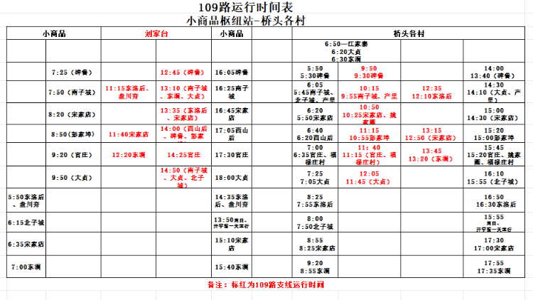 新开通109路支线运行时间:刘家台村委11:15-14:50;桥头枢纽站9:50-13:45。执行普通线路票制票价,线路等级为三级,享受优惠换乘政策。