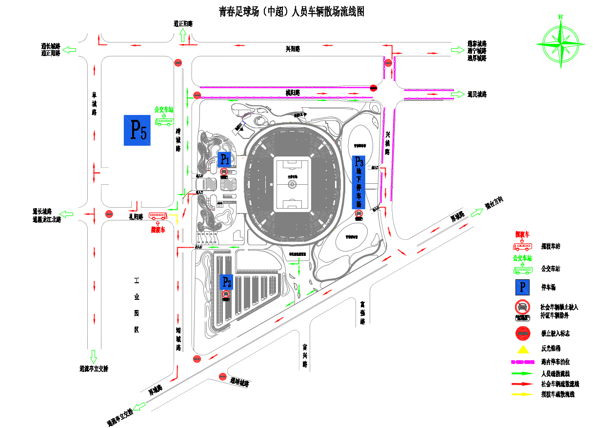P2停车场:位于靖城路足球场西门南侧,为媒体、工作人员停车区(须持通行证进入)。
