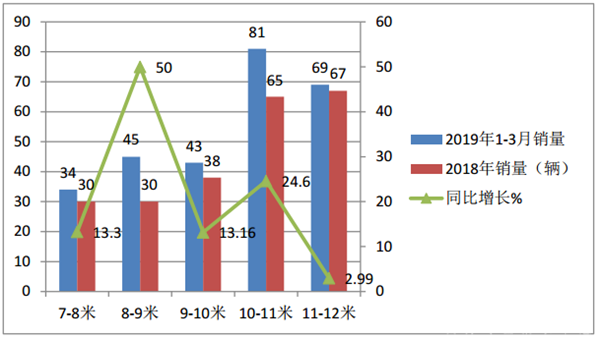 1、云南市场,2019年1-3月10-11米是主打产品,其次是11-12米,再次是8-9米,也就是说大型客车是云南旅游客车市场的主打产品。同比2018年同期,8-9米增幅最大,其次是10-11米段;11-12米同比增幅最小。