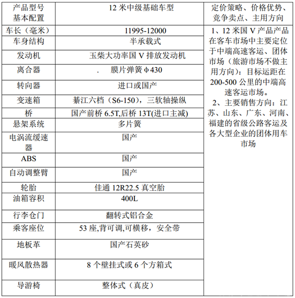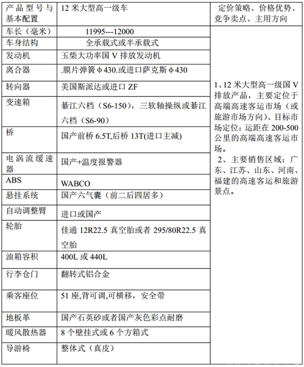 根据市场调研,五大区域主要目标客户的定位思路和目标市场:中高端高速客运和团体车市场(旅游市场为辅)的大型用车,以玉柴大功率国V排放发动机为基本动力,以潍柴国V排放大功率发动机等为辅助动力,价格在65万左右)