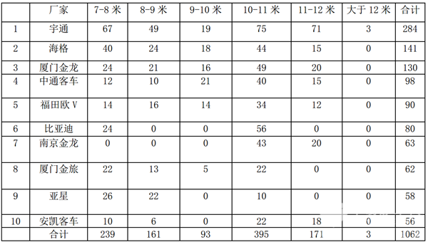 根据车管部门上牌统计可以看出,2019年1-5月在天津大中型客车市场发生销售的有25个客车制造企业。前10名主要竞争对手按长度段划分销售情况如下: