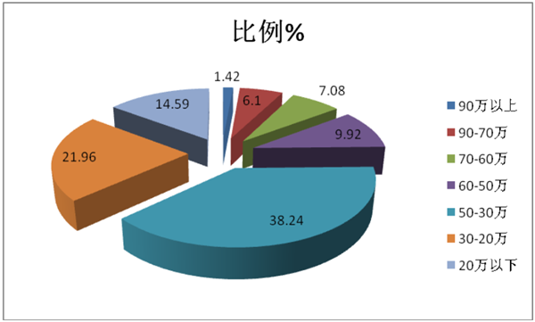从上图表可以看出:天津区域市场在2019年1-5月销售的大中型客车中,30-50万的中档客车销量最大,比例为38.24%,其次是30-20万区间的 价格,比例为21.96%,最小的是90万以上高档客车,比例只有1.42%,这说明了天津区域大中型客车的消费水平结构,给要进入天津区域的客车厂家在产品定价和 营销策略方面提供了依据。