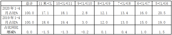 从上表可以看出:按长度段划分广东区域2020年1-4月公路客车市场结构,其特征: