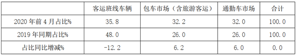 可见,在2020年前4月按目标用途划分广东公路客车市场结构: