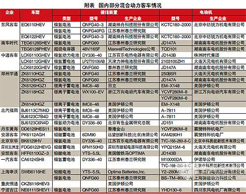 目前国内常见的并联式混合动力客车有EQ6110HEV1、BJ6113C7M4D、BJ6123C7B4D、DD6118HES21等。
