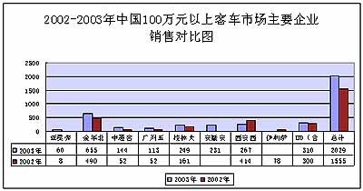 尽管受"SARS"的影响,但2003年的高档客运客车市场依然稳步增长。下图是2002-2003年中国100万元以上高档客车市场主要企业销售对比情况,我们可以看出,各企业的销售量基本上都在增长,有的甚至翻两倍以上。本文采用麦克尔.波特的五力模型,就100万元以上高档客运客车市场作简要的分析。