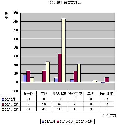 下表是04年1-2月份金华北方、广州五十铃、桂林大宇和宇通100万以上各车型销量情况: