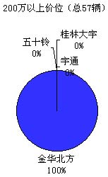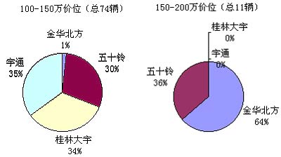 在100万以上的客车市场中,100-150、150-200和200万以上价位所占比例分别是52%、8%和40%。