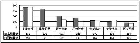 1~5月份大型客车企业(27家)的累计产量与去年同期相比普遍呈上升趋势,部分企业累计产量略有下滑,本期大型客车企业累计产量是9255辆,与同期累计相比增幅为55.34%;多数大型客车生产企业本期累计产量比去年同期呈现不同程度增长,其中以丹东黄海本期累计增长为42.55%,苏州金龙本期累计增长为52.79%,广州骏威本期累计增长为93.75%,沈飞客车本期累计增长为670%最为明显。同时,还有七家企业出现产量萎缩。