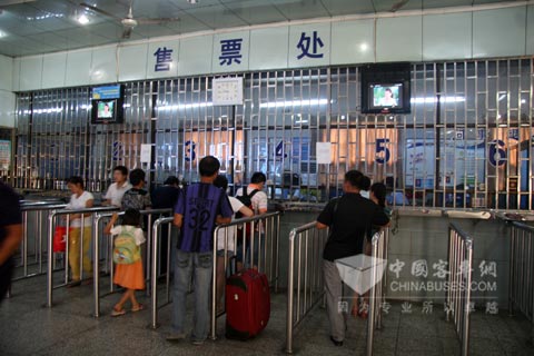 由于当天是周六,恰逢暑期,车站候车室里面人并不是太多,售票窗口前也井然有序,开辟的四个售票口前每个大约有5、6个人排队购票……