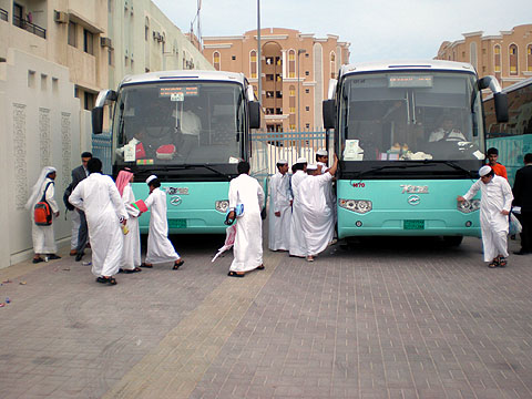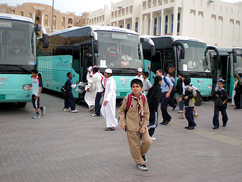放学啦 卡塔尔一学校的学生高兴乘座海格客车