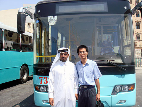 说起海格低地板公交车,还有一个有趣的故事。由于海格公交车采用了最新的电气技术,有很多新的功能和科技,一些卡塔尔的司机不是很清楚。公交车运行的第一天,我去了公交车站给部分司机做了培训。但到了第二天早上,就有电话打过来,说公交车路牌不显示、自动伸缩踏步不工作。我和同事谢工赶过去一看,原来是路牌的开关没有打开,一问才知道,今天换司机了,所以他不知道路牌开关在哪里。另外,对于车上装配的自动伸缩踏步,在仪表台上有个开关,如果仪表台上的开关没有打开,后门处的按钮也是不起作用的。我们把开关打开后,一切都正常,司机很高兴,连连赞扬我们的客车先进。