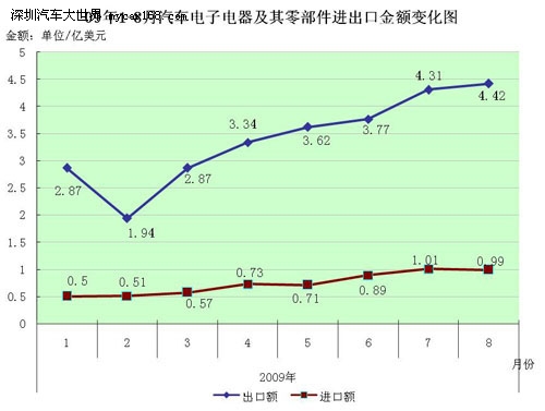 一、 2009年1-8月份国内汽车电子电器产品出口量一路上扬