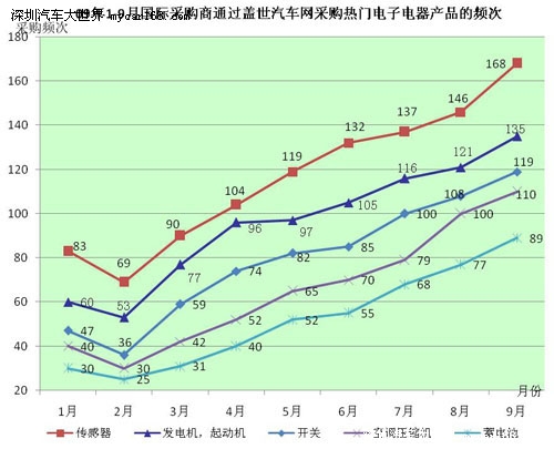 与此相对应,据全球领先的专业汽车零部件电子商务平台—盖世汽车网的统计数据显示,09年2-9月,国际采购商通过盖世汽车网采购的汽车电子电器产品均呈现出大幅度增长之势(如下图所示)。其中,热门采购产品主要有传感器、发电机/起动机、开关、空调压缩机、蓄电池等,平均每月采购频次分别为120、100、82、 68、54以上。与2月份相比,9月份热门采购产品的采购量增长幅度均达2-3倍。