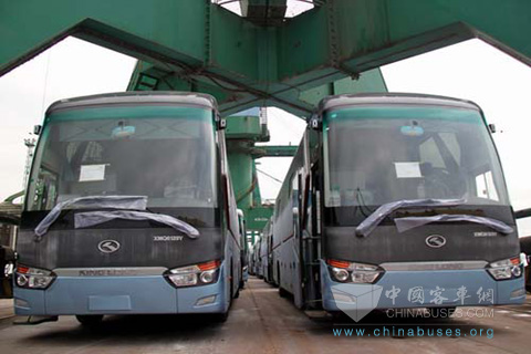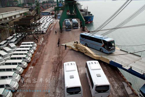 中国客车英文网[www.chinabuses.org]: 3月25日,经厦门海关验放,40辆大金龙豪华旅游客车在厦门东渡码头整齐列队,陆续驶上滚装船,驶往北非某国。据了解,这是大金龙与当地客户于今年1月签订的100辆客车订单中的最后40辆,早在3月20日,该批订单中的60辆公交车已经在上海装船,发往非洲。这也是自2005年以来,大金龙连续第6年向该国出口客车。目前大金龙累计出口到该国的客车已经超过900辆,在中国客车企业中名列前茅。当日,与这40辆旅游客车同时装船的还有大金龙出口埃及的180辆轻型客车。