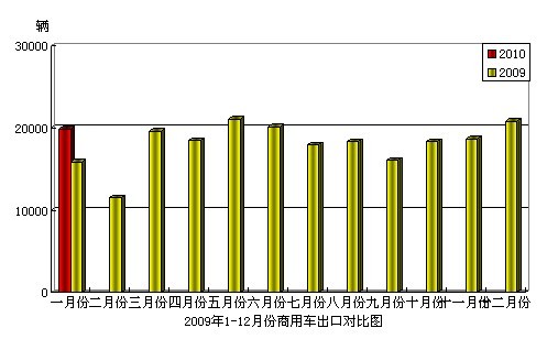 2010年1月份,商用车出口1.99万辆,比上月下降了4.32%,比去年同期增长了25.64%;创汇金额3.71亿美元,比去年同期增长了1.89%。其中:货车产品出口1.59万辆,比上月下降了1.63%,比去年同期增长了19.89%;创汇金额2.22亿美元,比去年同期下降了0.52%。