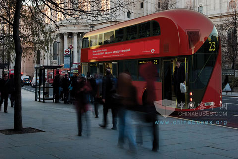 www.chinabuses.org: 近日,伦敦市长鲍里斯约翰逊和伦敦运输局长彼得亨迪共同为伦敦新公交车揭幕。伦敦新公交车的最终造型是在广收好评的Routemaster公交车的基础上进行改进的。