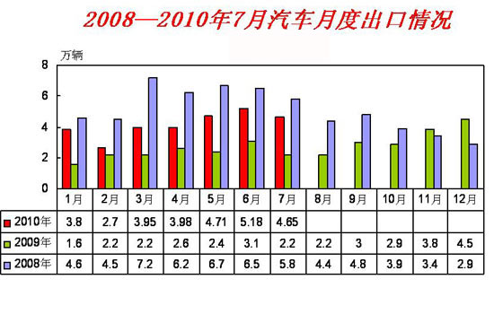 刚刚出炉的中国汽车工业协会统计的汽车整车企业出口数据显示,2010年7月,汽车企业出口4.65万辆,比上月回落10.33%,但比上年同期增长1.07倍。1-7月,出口28.89万辆,比上年同期增长75.33%。
