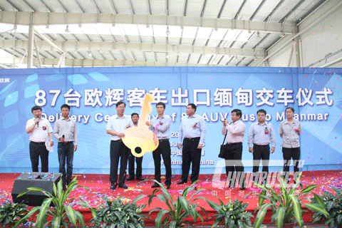 中国客车英文网[www.chinabuses.org]: 7月13日,在福田欧辉客车广东工厂举办了87台欧辉客车出口缅甸交车仪式。福田汽车集团副总裁、欧辉客车事业部总经理解佃峰将一把象征着出口缅甸奥肯博公司的欧辉客车模型钥匙交到了奥肯博公司董事长姜建华的手中,标志着“福田欧辉客车出口缅甸奥肯博公司大客车交车仪式”取得圆满成功。
