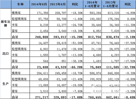 巴西6月各车种出口量全面下滑,6月出口量仅23,408辆,同比下降46.2%,其中乘用车出口量减少51%,仅有14,40辆,轻型 商用车出口量减少39.9%,卡车出口量减少13%,客车出口量减少36.1%。