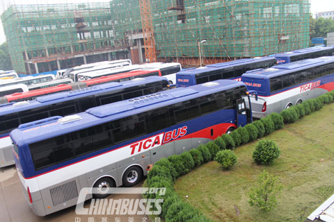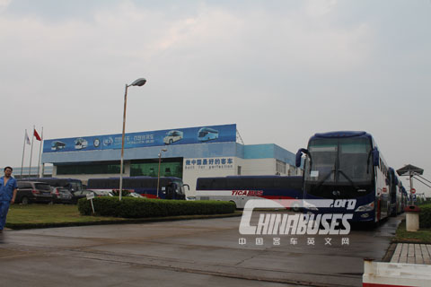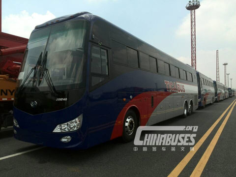 中国客车英文网[www.chinabuses.org]: 2014年7月29日,百路佳停车场内,新一批即将发往南美市场的JXK6140客车全部整装待发,等着发车前的最后检验。