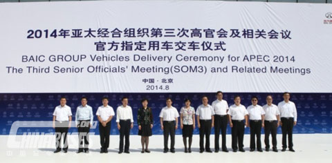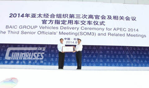 中国客车英文网[www.chinabuses.org]: 8月5日,福田汽车“2014年亚太经合组织第三次高官会及相关会议官方指定用车交车仪式”在京举行。仪式现场,2014年亚太经合组织会议北京市筹备工作领导小组办公室副秘书长熊九玲为福田汽车授予“2014年亚太经合组织第三次高官会及相关会议官方指定用车”荣誉铭牌。福田汽车将提供包含蒙派克S级、蒙派克E级、G7以及欧辉客车等产品全程服务APEC系列会议。