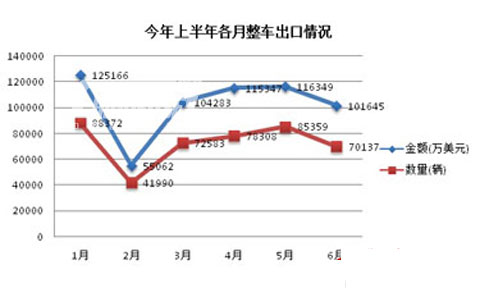 1.出口量持续下跌。今年上半年,整车出口43.7万辆,同比下降8.83%,出口额61.77亿美元,同比增长1.06%。整车出口数量延续了去年的下降态势,出口额在一季度出现拐点后,逐步启稳回升,但增幅有限。