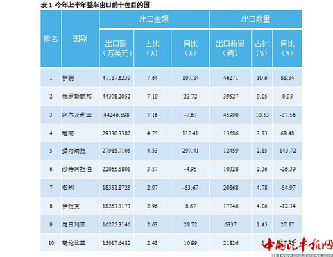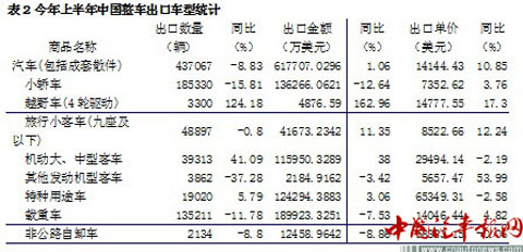 4.小轿车、载重车两大主力车型出口下降。小轿车、载重车是我国整车出口的主力车型,但上半年无论是出口量还是出口额均双双下滑,从而导致整车出口总体下降(见表2)。目前,小轿车是我国整车出口量第一、出口金额第二大车型;载重车是我国整车出口量第二、自主知识产权汽车出口第一大车型,也是整车出口金额最多的车型。这两类车型出口形势的好坏将直接关系今年整车出口全局。