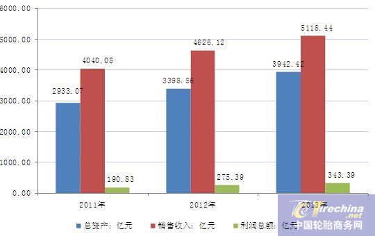 2011-2013年中国轮胎行业总资产、销售收入、利润情况