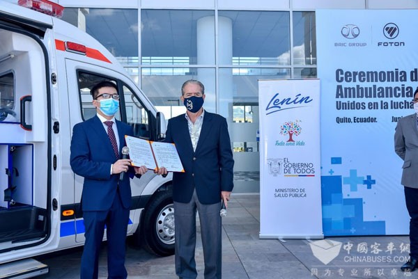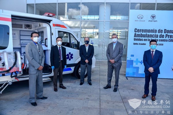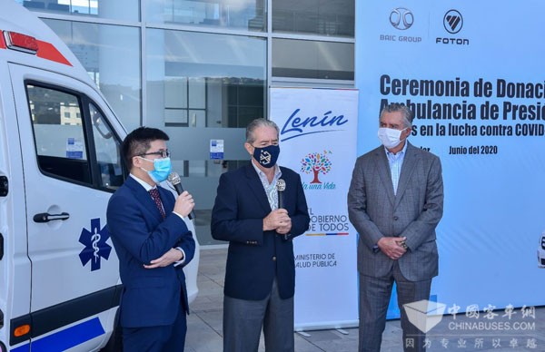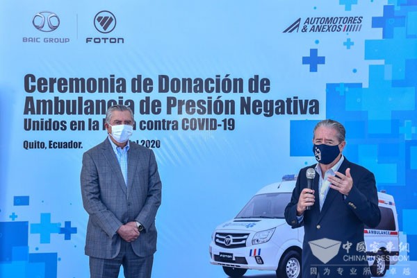 中国驻厄瓜多尔大使馆经济商务参赞陈峰表示,疫情发生以来,中厄两国始终守望相助,在中国抗疫的艰难时刻,厄瓜多尔给予了中国很多帮助,我们始终铭记在心,并且在厄发生疫情的时候,中国投桃报李,通过各种渠道给厄方捐赠了很多抗疫物资。北汽福田作为中国商用车领军品牌,也在积极履行品牌社会责任,主动投入到属地抗击疫情的工作当中,相信此次捐赠的负压救护车对于厄瓜多尔转移和救治新冠肺炎病患起到积极作用。