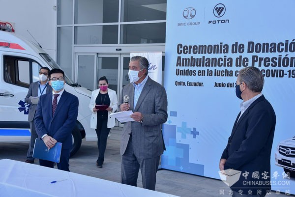 作为此次捐赠北汽福田方代表,福田中美大区总经理李诚向各方表达了此次捐赠的初衷。助力全球抗“疫”,是身为一家有态度、有能力、有责任感的中国商用车企业应尽之责。北汽集团及旗下北汽福田是中国汽车行业的中坚力量,自进入厄瓜多尔市场以来就积极践行企业社会责任,并时刻关心厄瓜多尔疫情发展,关心厄瓜多尔的朋友和客户。厄爆发疫情以来,北汽福田积极分享中国抗疫经验和实践,并通过防疫物资捐赠等方式助厄抗击疫情,以尽微薄之力。并希望福田图雅诺负压救护车,在后续的厄抗疫工作中起到积极作用,并相信在厄新冠战斗很快将取得胜利。