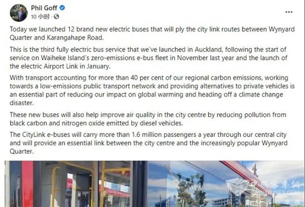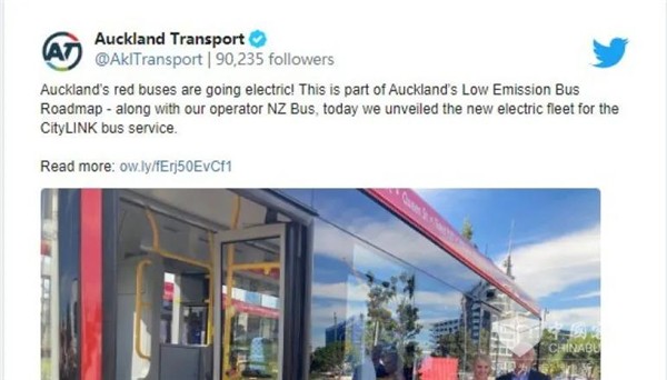 奥克兰交通局官方推特发文称:“奥克兰的红色大巴正在电动化!这是奥克兰低排放巴士路线的一部分,今天与我们的运营商NZ Bus 一起,我们为CityLINK 巴士服务推出了新的电动车队。”