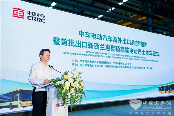 宁波市副市长陈炳荣在致辞中表示:“宁波中车产业基地是中国中车集团与宁波市合力打造的战略性新兴产业重要基地。浙江电车落户以来,不断推陈出新,加快海外市场布局,产品远销东南亚、欧洲、大洋洲。”