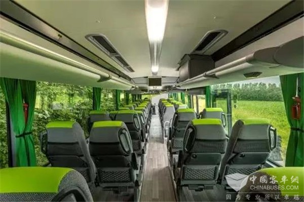 车内空间宽敞,内部高度至少两米,并配有手提行李架。它能容纳44名乘客,配有舒适的座椅,椅背背面带有小桌板、杂志网和行李空间,车上安装有2个19英寸的液晶显示器,并配置了卫生间和空调。通过车上的USB接口,乘客可以给手机、平板电脑、MP4播放器充电。