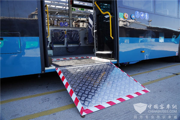 为实现车辆的低能耗,达到节能的价值要求,该车型应用了轻量化技术,从结构轻量化和材料轻量化两方面降低整车自重,带来更低的能耗。整车除了装有ECAS车身高度调节系统、EBS制动系统、司机离座报警装置等安全配置以外,在细节上更是注重人性化设置,比如在每排座位都布置了下客按钮,下客门的扶手按钮还贴心地留有一个低矮些的按钮,供儿童使用。金旅用多年的新能源产品开发经验和丰富的新能源客车运营经验为保加利亚市场打造满足当地民众出行需求的产品。