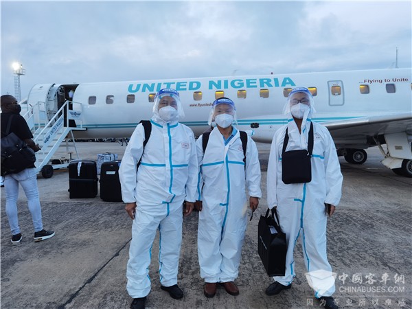 海外差旅,每转机一次,便增加一份风险。 尼日利亚的CKD项目需要技术援助,时间催得紧,2021年9月8日,金旅海外销售公司东南非销售业务部经理付天骄和工程师挺身而出。他说,从厦门到尼日利亚,总共需要转机4次,一路上,他们全程佩戴着护目镜、防护服、防护手套和口罩,强忍闷热难受,尽量不吃饭不喝水,以减少被感染的风险。落地后还要再坐3小时的车,差不多两天的舟车劳顿后,才抵达目的地。